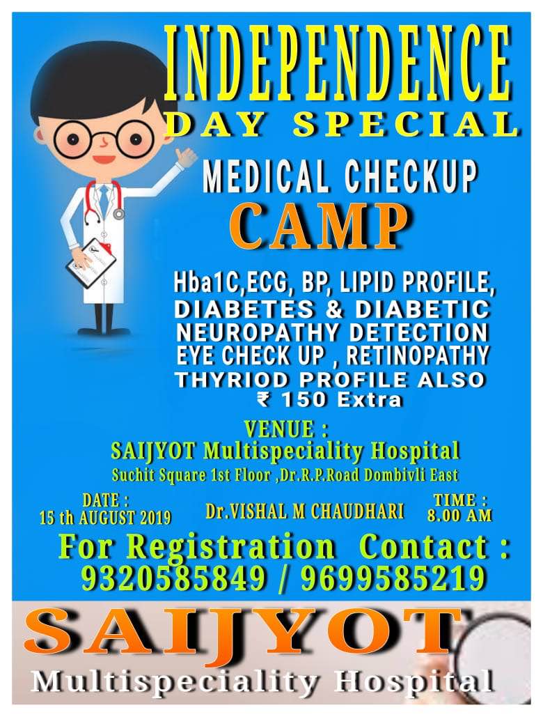 Independence Day special Mega Medical Checkup Camp organised by Saijyot Hospital in Dombivli East please visit your full family members, friends.